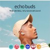 Echo Buds - No end in sound. Rich, balanced sound, crisp audio, and up to 20 hours of battery life will keep you locked in for whatever audio experience you crave. True wireless earbuds -High quality sound. Grab sound by the ear with sweat resistant, Bluetooth 5.2 earbuds featuring 12mm drivers, 2 mics and a voice detection accelerometer for crystal clear communication. Hear all of your music, podcast, audiobook, phone call, or whatever you choose to listen to, untethered. Embrace the power of wireless listening with Dual Connect. Enjoy music or make calls with just your left ear, right ear, or both buds at the same time. Seamless switching - Move from a video call on your laptop to music on your phone without skipping a beat. Multipoint pairing lets you move freely between two connected devices like your phone, laptop, smart speaker, or tablet. Take Alexa with you - Ask Alexa to play a song, make a call, set a reminder, get directions, and more. In the box: Echo Buds, charging case, 2 pairs of silicone earbud covers and Quick Start Guide. USB-C charging cable (required) is not included with Echo Buds.