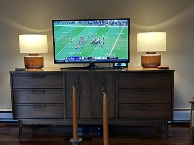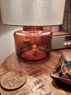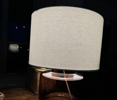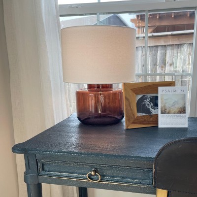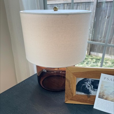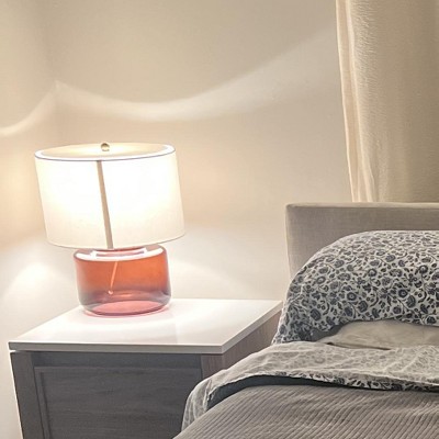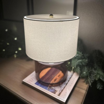 Update your table lamp collection with the Amber Glass Table Lamp from Threshold™. This table lamp features a white drum-shaped shade and an amber-hue glass base with a translucent design for an appealing look. This table lamp has a rotary turn knob with a one-way light setting for quick on and off.