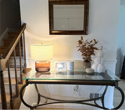 Couldn’t love this lamp more. The deep brown color adds a little bit of class and depth. Using it on our desk in the kitchen. Love that the lampshade has a top/cover, too. And the brass detail. Perfect for what we were looking for!
