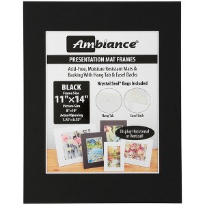 The Ambiance 5-Pack Presentation Mat Picture Frames provide an acid-free, conservation-grade display for your fine art, prints, or photographs. This modern picture frame features a 4-ply (1.4mm) acid-free mat with a white bevel. We adhere strips of acid-free board between the mat and the backing to create a frame pocket with one open edge, making it easy to slide your picture into the frame for convenient display. Moisture resistant, acid-free leatherette protects the frame backing from wear and tear. With a hang tab and an easel back option, you can hang your frame on the wall or display it on a table. Each mat comes packaged in a Krystal Seal® bag, which offers the safest acid-free environment for your artwork. 90-day warranty for any returns, shipping charges may apply.