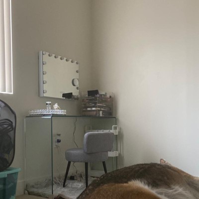 It makes a great vanity table. There’s no assembly required. You have the option to add the metal corners, which I did. It goes with any decor.