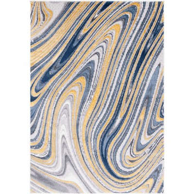 Introduce a touch of elegance and modern sophistication into your home with our contemporary styled area rug, available in a convenient 4 X 6 small rectangle size. Designed with an eye-catching blue and gold color palette, this rug features a dynamic pattern of swirling waves that weave together in a harmonious dance of color and form.