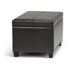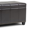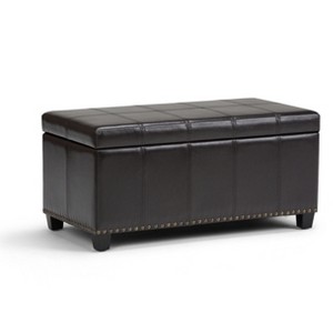 Hand constructed using solid wood, engineered wood and high density foamUpholstered with a durable Tanners Brown PU Vegan Faux LeatherFeatures large interior storage space with child safety hinge to prevent lid slammingMulti-functional ottoman can be used in bedroom, living room, family room, hallway as an entryway bench, foot stool, accent furniture or provide additional sittingTransitional design includes stitched detail and nailhead trim at the bottomSimple assembly; just attach legsDimensions: 33.5a€? W x 18a€? D x 16.5a€?HEfforts are made to reproduce accurate colors, variations in color may occur due to computer monitor and photography