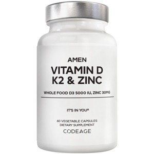 Amen Vitamin D, K2, and Zinc supplement delivers 5000 IU of vitamin D3 as cholecalciferol, 30mg of zinc as amino acid chelate, and vitamin K2 (MK-4 & MK-7), along with an organic blend of apple, blueberry, cranberry, and elderberry powder.