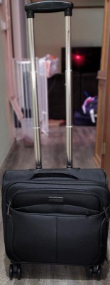 [This review was collected as part of a promotion.] I’ve been using this for about a week so far. It has ample storage, I believe even a spot for shoes. A place for your laptop up to 16” and other types of work supplies needed. The telescoping handle easily goes up and down with no issues or getting stuck. I tried that quite a few times to accurately test it out and had the same smooth glide each time. The wheels turn so smoothly. They glide across hardwood, ceramic, cement very easily and with no snags/trip ups. I do like that o can attach my other bag to it and use the top as a resting/sitting spot for it. All in all, very nice, simple travel work carry on.