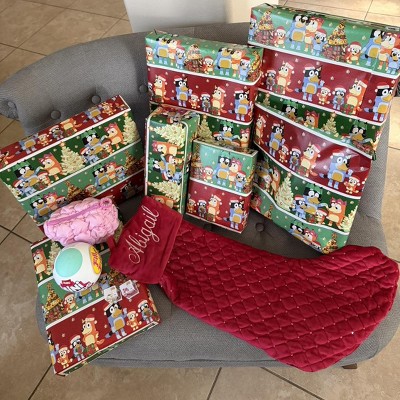- This Plus Mark wrapping paper features adorable characters from Bluey celebrating the holiday season.