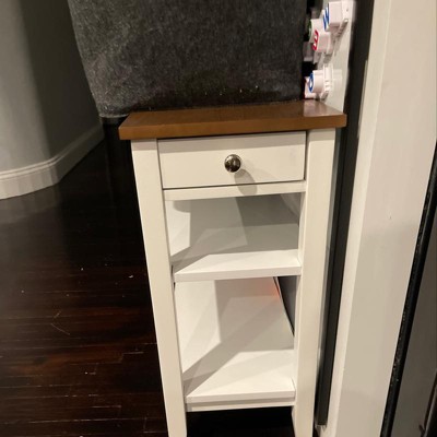 The top is a much darker brown than I had hoped. I wish I could take the bottom level out so I can place a basket under but the whole shelf is too weak and won’t be stable without it. The two shelves make the storage height a little too short which is annoying. The drawer is nice though.