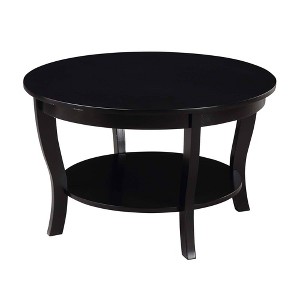 The American Heritage Round Coffee Table by Breighton Home is a stunning blend of traditional charm and classic elegance. With two round tiers of shelving, it offers plenty of space ideal for showcasing home decor or storing family room essentials. Its lightweight design is easy to move if needed while its construction from manufactured wood adds durability. Curved solid wood legs and a rich finish enhances its sophistication, making it a beautiful addition to any room. The simple yet elegant farmhouse feel of this table makes it a versatile choice for your home. Complete your interior decor by pairing it with coordinating pieces from the American Heritage collection by Breighton Home, each sold separately.