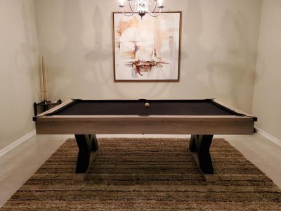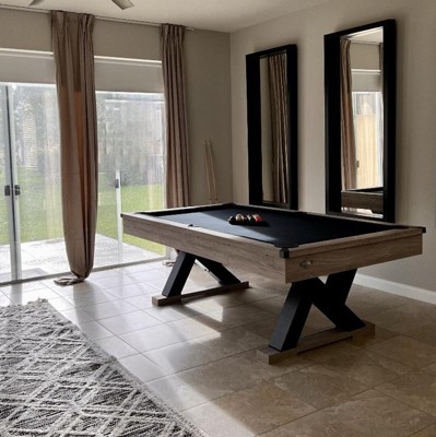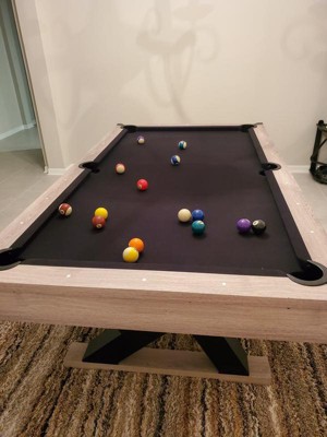 This table is modern looking and replaced our dining room table. It is quality material for being a cheaper table. Building it was easy since you just have to attach the legs. Flipping it needed 3 people since it is more than 250 lbs. I will say that the balls don't roll as far with a hit like a slate table (tables you find in bars) but once you get used to that the play is good. We just love it. The balls are good quality, sticks are decent. We had to buy some shorter sticks anyways though since our room is a bit tight with the size of the table. We just love it!