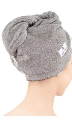 After Shower: Simply wrap the towel around your wet hair, twist it, and secure it with the button tie.