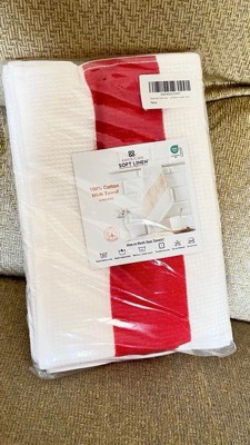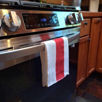 [This review was collected as part of a promotion.] These are fantastic! I love the extra large size! We always leave a towel hanging on the oven, the size keeps them from slipping and falling onto the floor. The waffle weave makes these super absorbent for lots of hand washing or spills. They’re also thin and dry better than a traditional cotton towel. They washed well, no bleeding of the red accent color onto the white. I’m sure these will last a long time, they’re so well made. Highly recommend!