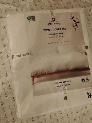 [This review was collected as part of a promotion.] I received this duvet cover in white, which I was a little hesitant to to use for the guest bedroom, but I ended up using the duvet cover and pillow shams so I will see how it holds up. The material feels very soft not like top quality cotton but it’s not bad. It is 100% Turkish cotton which I hear is softer. It has a cool satin touch which is great for sunny CA. Overall, it is a nice set and I would not hesitate to purchase additional linens from this company.