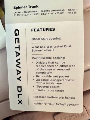 Getaway Trunk has a 50/50 split opening with the most versatile packing to maximize your trip! Push-button locking handle adjusts to multiple heights. Dual spinner wheels offer 360-degree effortless maneuverability on any surface. Rugged ABS hardside shell with interior divider panels can be repositioned on either side of the case to pack the way you want! Also features a zippered u-shape divider panel with mesh pocket and AirTag® device holder.