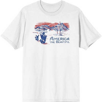 Step into the patriotic embrace of Americana with this apparel, featuring a stunning red and blue image of cacti and mountains alongside bold blue letters that proclaim "America The Beautiful." Crafted from premium materials, this apparel offers both comfort and style for every proud American. Easily maintain its quality with simple care instructions. Just machine wash it on cold with like colors and tumble dry on low heat.