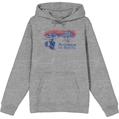 Show your patriotic side with this adult heather gray Americana long sleeve hooded sweatshirt, showcasing a picturesque landscape of mountains and cacti beside bold blue letters that proudly proclaim "America The Beautiful." Crafted from a blend of cotton and polyester for unparalleled comfort and durability, this hoodie features an adjustable hood for added versatility and protection against the elements. Easily maintain its pristine condition by machine washing it on cold with like colors and tumble drying on low heat.
