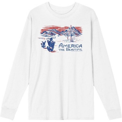 Step into the patriotic embrace of Americana with this apparel, featuring a stunning red and blue image of cacti and mountains alongside bold blue letters that proclaim "America The Beautiful." Crafted from premium materials, this apparel offers both comfort and style for every proud American. Easily maintain its quality with simple care instructions. Just machine wash it on cold with like colors and tumble dry on low heat.