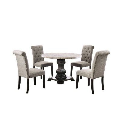 Compact yet functional, this set seats four comfortably. The chairs slide neatly under the table when not in use, maximizing space. The marble-look top provides a generous surface for meals and gatherings, making it both beautiful and practical.