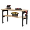 - 48" Adjustable 2-Tier tool bench - Built in pegboard - ETL certified power strip - Hooks include Dimensions: 48" (L) x 20" (W) Height Adjustment Range: 28.7"-38.5" Material: Steel frame with rubber wood surface Power Strip: ETL certified,4 AC outlets, and 2 USB-A ports Weight Capacity: Up to 2000 lbs Color: Black frame with natural wood work surface Users:DIY Enthusiasts/Professional Woodworkers/Craftsmen/Mechanics/Automotive Technicians/Electronics Engineers/Manufacturing Workers/Educational Institutions/Training Centers/Model Makers Recommended Place:Home Workshops/Garage/Manufacture/Educational and Training Facilities/Gardening and Outdoor/Art and Craft Studios Precautions: - Before starting any work, make sure the workbench is placed on a flat surface and that all brackets and screws are securely tightened. - ensure the cables are neatly arranged, so they don’t obstruct your work or cause tripping. Also, avoid contact between power cables and sharp objects or heat sources.