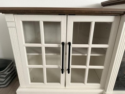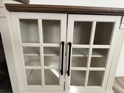 • Farmhouse Style and Aesthetic: Fireplace TV stand features clean lines and extra long top panel overhang design, complemented by glass cabinet doors with cross-beam designs and metal handles for a vintage-inspired touch