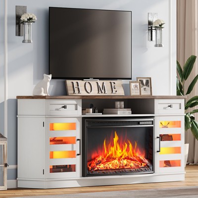 AMERLIFE Floating Fireplace TV stand is equipped with a fireplace with 8 flame colors, temperatures, and timings that can be controlled by remote control or buttons. Works with or without heat. TV cabinet with smart LED lights to create your favorite home atmosphere!