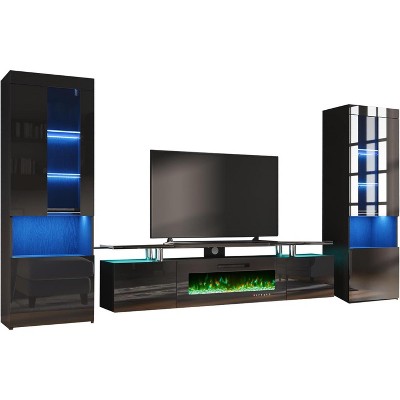AMERLIFE Floating Fireplace TV stand is equipped with a fireplace with 8 flame colors, temperatures, and timings that can be controlled by remote control or buttons. Works with or without heat. TV cabinet with smart LED lights to create your favorite home atmosphere! Modern TV stand adopts a suspended design. You can decide the height of the TV console according to your preference. It saves floor space and keeps your room clean at all times. Unique design of the media console's high-gloss doors add a stylish charm to your room. Enclosed storage space provides plenty of room for a variety of household items. Open cubbies are perfect for holding media components such as cable boxes, game consoles, and more. Cable holes keep cords organized. SPECIFICATIONS TV Size: 70"W x 13"D x 19.3"H Fireplace Size: 36"W x13.7"H TV Size: 80"W x 13"D x 19.3"H Fireplace Size: 40"W x13.7"H Color: White/ Black Power: 1400W Material: Engineered Wood Weight Capacity: 220lbs Assembly Required: YES