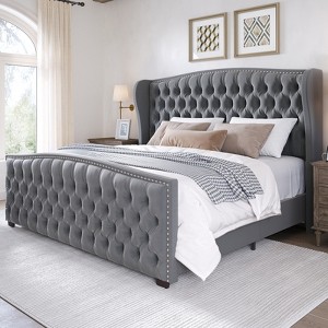 this king size platform bed features a wingback headboard, hand-tufted velvet upholstery with nailhead trim,