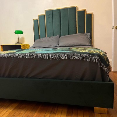 [This review was collected as part of a promotion.] This bed is so beautiful. I love everything about it. It is heavy and sturdy. It is pretty high for a low profile frame with no box spring. It was very straightforward to put together and you don’t need additional tools. I love the deep forest green and gold trim, which go so well with hardwood. I love the art deco style. I love the soft feel of the velvet headboard. Installing it, my room feels simultaneously more dramatic/luxurious and more cozy. I received an incentive to write this review.