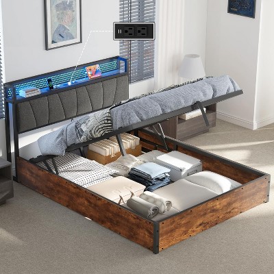 AMERLIFE Lift Up Bed Frame with Linen Upholstered & LED Light & Storage Headboard