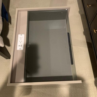 [This review was collected as part of a promotion.] This is a great side table to use next to your bed. It has two drawers and then a slot that has a glass viewing spot in front of it. That makes it easy to put things away that you don’t want to be private and easily see them. You can also put things on top of the glass, but you should be careful because it just slides in and doesn’t have a lot of support . There is an outlet built into the table. I received an incentive to write this review.