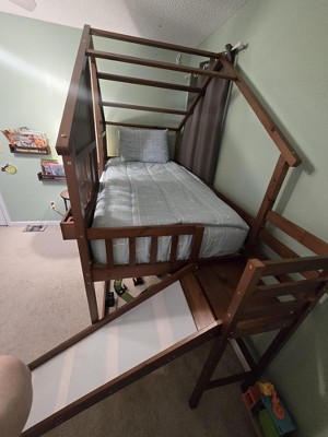 We got this beautiful low loft bed for our son's 5th birthday. He was thrilled when he saw it! I love that the slide is on the end and not the actual bed area. He loves going down the slide in the morning. We love having the windows with the little baskets to put small toys or his water at night. We are using the bottom bunk area for a toy/book area which we love. It is challenging to make up so we bought beddy's zip up bedding which helps alot. We have a 10 inch mattess on the top bunk which doesn't give our son much extra bedding rail but with it against the wall we feel he has enough to keep him in the bed without fall out. My husband said it was alot of pieces but got it together in about 4 hours.