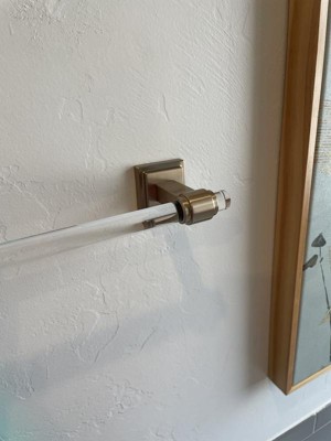 [This review was collected as part of a promotion.] This towel bar was super easy to install, i installed it in a couple of minutes and no sweat. I love the clear bar, I love the design to the point I did not want to put a designer towel over the bar to cover the clear bar I wanted it to show, the gold pieces at the end was a perfect added ascent piece. I hang a towel over top of the clear bar and allowed the end of the towel to fall in the middle of the clear bar.