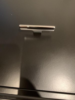 [This review was collected as part of a promotion.] The Riva 2-1/2 in (64 mm) Length Polished Chrome Cabinet Knob comes with 2 sizes of screws and attches easily. I like the shape of this handle, it is easy to grab and looks great. It is sturdy, strong and well made. I fit nicely on my pre-existing drilled hole of my cabinet. I love the new updated look of my drawer as well.