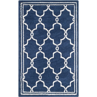 Elevate your space with this exquisite 2'-6" x 4' accent rug, boasting a timeless ivory and navy geometric pattern that exudes elegance. Crafted in Turkey with precision power-loomed techniques, this rug ensures durability and consistent quality. Its plush 3/8" pile height is inviting underfoot, made from a meticulous blend of 67% Polypropylene, 18% Fibrillated Polypropylene, 8% Latex, and 7% Poly-cotton (warp), creating a luxurious yet resilient surface. OEKO-TEX certification guarantees that the rug is free from harmful substances, ensuring safety and peace of mind for your home environment. Perfect for adding a touch of sophistication to any room, this rug is not only a stylish choice but also a testament to modern craftsmanship and eco-conscious living.