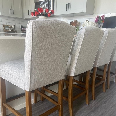 A: Our sophisticated Amory Counter Stool is upholstered in a sleek cream fabric, which leans more toward beige rather than gray. The elegant design features a tall wing back for support, high-density foam for maximum comfort, and sturdy birch wooden legs with an elm finish. Depending on lighting, the cream tone may appear slightly different, but it is primarily a warm, neutral shade. We hope this helps, and we appreciate your interest in our product.