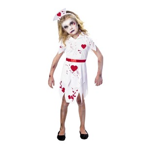 - This classic nurses costume has a spooky twist because it features a tattered white uniform dress with a Red band sash belt. The dress is splattered with blood stains and matching red cross logo on the dress and on the nurse headpiece. Complete it with a scary makeup for a spooky zombie look