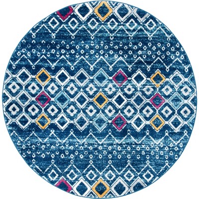 Introduce a splash of contemporary sophistication into your home with our 6'-7" X 6'-7" round area rug, boasting a stunning navy and aqua geometric pattern that will captivate and complement your living space. Expertly crafted in Turkey using power-loomed techniques, this rug offers a durable 100% polypropylene pile that promises resilience and easy maintenance. With a comfortable pile height of 1/4", it's perfect for high-traffic areas, offering both comfort and longevity. This chic, round area rug is not only a stylish centerpiece but also OEKO-TEX certified, ensuring it meets high safety and environmental standards. Elevate your decor with this eye-catching addition that seamlessly blends luxury and practicality.