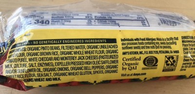 organic pinto beans, filtered water, organic unbleached wheat flour, organic brown rice, organic whole wheat flour, organic tomato purée, white cheddar and monterey jack cheeses (pasteurized milk, culture, salt, enzymes), expeller pressed high oleic safflower and/or sunflower oil, organic onions, organic bell peppers, organic sweet rice flour, sea salt, organic wheat gluten, spices, organic garlic' '