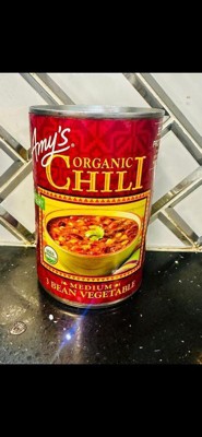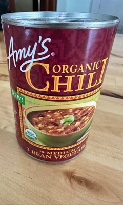 Amy's Organic 3 Bean Vegetable Canned Chili is made from organic beans, tofu and veggies simmered in a flavorful medium-spiced sauce. Amy's chili is a plant based organic chili that everyone will enjoy. Our high protein medium chili is made with organic ingredients, so you can feel good about serving this vegetarian food as a delicious appetizer, side dish, dinner or lunch food. This gluten free chili is vegetarian and vegan-friendly, making it a great option for those with dietary restrictions or preferences. This canned chili is easy to prepare: simply heat it up and serve.