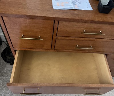 I love how modern and sleek the dresser is. It has such a warm color to the wood and the directions were helpful! The only downfall is the drawers do not extend all the way out, but I think if you were to move the brackets closer to the end of the edge of the dresser, they would be. Anyways, I love the way it looks and it does its job.