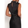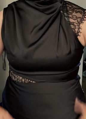 I have been tasked with finding myself a midi length black satin dress to be a part of my friend's bridal party that couldn't have pattern or texture which you would think would have been a simple task. I'm 5'-4" with a short torso and broad shoulders. It needed to be midi length so you could see our cute shoes and I tried on soooo many and none really did anything for me until this one. It was also important to me that the dress I buy be able to have a life after the wedding and be something I would actually want to wear again. The lace on the sleeve is stunning and I think looks really nice on my arms. The high neck is more conservative than I thought I would have been drawn to but it all came together so nice. My only critique is that the high neck is a little too high so I will be folding it down best I can and putting a few stitches to keep it in place, otherwise I would have given is 5 stars!