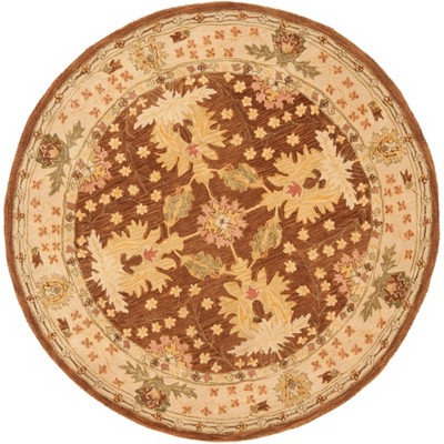 Elevate your living space with the timeless elegance of our 6' X 6' Round hand-tufted area rug. Crafted with a luxurious wool pile, this exquisite round rug in rich brown and tan hues showcases a sophisticated pattern that exudes traditional charm. The intricate design, featuring a central medallion accented by florals and scrolling vine motifs, is framed by an ornate border, creating a focal point that is both classic and captivating. Made with skillful artisanship in China, this rug's high-quality construction ensures lasting beauty and underfoot comfort. Whether nestled under furniture in your living room or greeting guests in your entryway, this piece is sure to add warmth and style to your home decor.