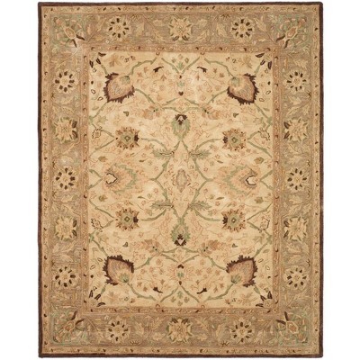 This rug looks nothing like the picture. It looks very much like the Safavieh Antiquity AT859, of which I bought four and all four were damaged. I opened this rug up, rolled it out and couldn't believe my eyes...no defects, no damage and looks uncannily like the one I mentioned above. The colors are taupe and beige background with cranberry red, grey-blue, white, muted gold and black. It is perfect!! I don't like to have everything in my house match. This rug is in my living room area. There is a much brighter rug (looks nothing like this one) in my dining area which is open to the living room. In the last few months I've probably ordered a dozen rugs to find two. This rug is absolutely gorgeous. I'm finally satisfied!!