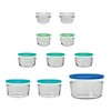 - INCLUDES: (2) 1-cup, (2) 2-cup, (1) 4-cup, (1) 7-cup round glass food storage containers, (1) 6-cup rectangle with mixed blue SnugFit lids, (2) custard cups with clear lids. Unlike plastic, our glass tupperware doesn’t stain, warp, or retain smells.