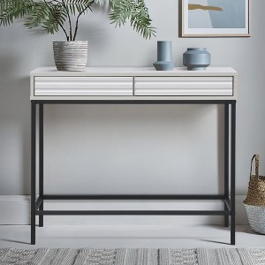This sleek console table combines minimalist design with functional storage, making it an ideal addition to any entryway, hallway, or living space. Featuring two spacious drawers, it offers ample space to keep essentials organized and out of sight. Its sturdy frame ensures durability, while the clean lines give it a contemporary feel, blending effortlessly into modern interiors.