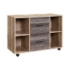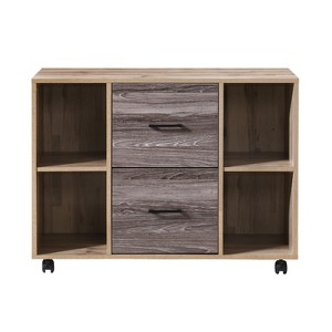 Enhance your office organization with this modern multifunctional file cabinet. Made from high-quality engineered wood, this cabinet features a sleek design with ample storage options including two large drawers, multiple open shelves, and a spacious top surface. The cabinet is designed with a rustic finish available in oak, black oak, and walnut, making it a stylish and functional addition to any office setting. The cabinet is also equipped with casters for easy mobility.