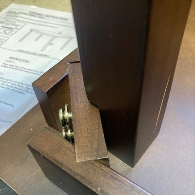 The provided screws are longer than the corner block and the width of the table leg. My screws are sticking out 1/4 inch, it’s tightened as far as it can go, and bursting out the back end.