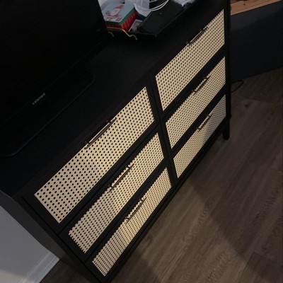 Bring added storage space to your bedroom with the Andros 6 Drawer Dresser from Buylateral. Featuring textured faux cane drawer fronts in natural which nicely complements the dressers black finish. Six spacious drawers provide ample space for all your wardrobe needs. Constructed of particleboard with solid rubberwood legs and antique metal handles in a gold-tone finish that highlight a mid-century retro vibe.