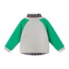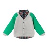 • Light gray cardigan with bright green raglan sleeves over a plaid button-up shirt.