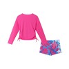 Keep her looking sporty and stylish with this vibrant two-piece swim set! Featuring a bright pink long-sleeve rash guard with adjustable ruched sides and matching floral swim shorts, this set offers maximum comfort and UV protection for all her water adventures.