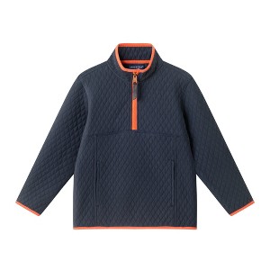 Keep cozy in this diamond-quilted navy half-zip pullover, elevated with bright orange trim for a pop of sporty style. The soft yet structured fabric provides warmth without bulk, while the stand collar and half-zip closure make it perfect for layering. Roomy front pockets offer both function and comfort, making this pullover an ideal choice for school, play, or weekend outings.